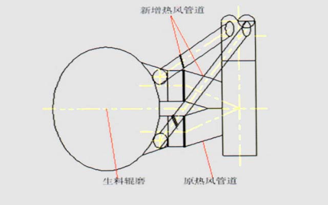 - 對(duì)生料輥磨熱風(fēng)管道實(shí)施改造,在原有熱風(fēng)管道基礎(chǔ)上并聯(lián)增加兩根管道,入磨阻力明顯下降,負(fù)壓降到-1000Pa,出磨溫度上升10℃。