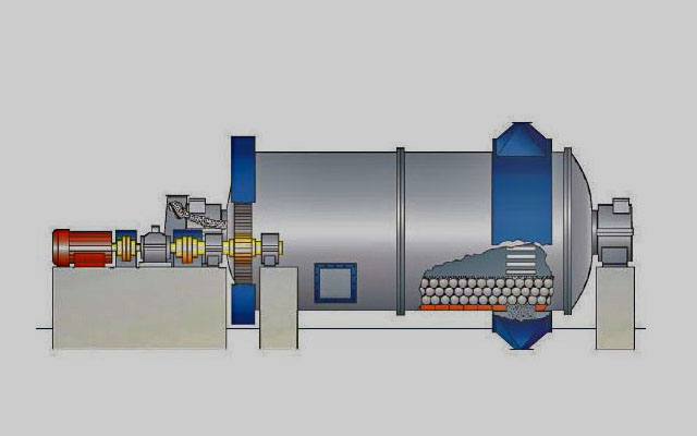 根據(jù)被磨物料的粒度選擇,物料通過進料端進入球磨機的筒體中。當球磨機的筒體開始旋轉時,研磨體會貼附在筒體附近的襯板上。由于慣性、離心力和摩擦力的作用,隨著筒體的旋轉,研磨體達到一定高度時,研磨介質(zhì)會被拋下?lián)羲橥搀w中的物料。