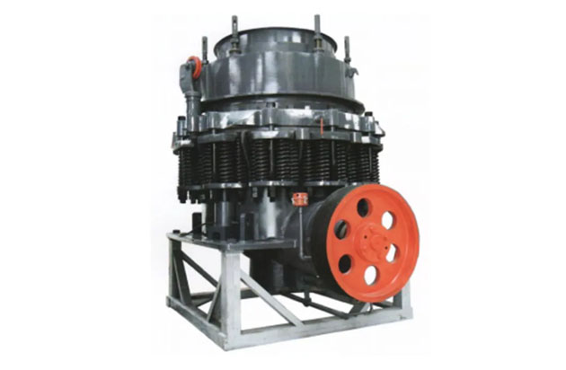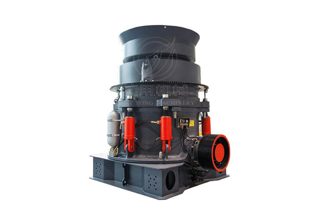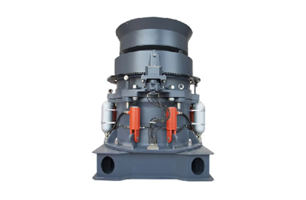 HP 系列液壓圓錐破碎機(jī)工作時(shí),電機(jī)通過皮帶輪和三角帶帶動(dòng)設(shè)備傳動(dòng)軸轉(zhuǎn)動(dòng),傳動(dòng)軸通過大小錐齒輪帶動(dòng)偏心套繞主軸轉(zhuǎn)動(dòng),偏心套帶動(dòng)動(dòng)錐做旋擺運(yùn)動(dòng),使動(dòng)錐和定錐時(shí)而靠近、時(shí)而遠(yuǎn)離軋臼壁,物料在軋臼壁和破碎壁形成的破碎腔內(nèi)不斷受到擠壓、沖擊而破碎,破碎的物料從底部排出。