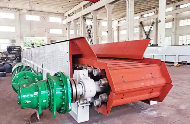裝置安裝在礦倉出口底部,礦石落到溜槽底部的漏板上,漏板底部固定在托輥上,通過偏心機構連接漏板和減速機連在一起,然后通過聯軸器襯在電機上。運轉時電機通過聯軸器帶動減速機,通過偏心盤和位于機架底部的托輥之間的漏板作往復直線運動,實現均勻進給。